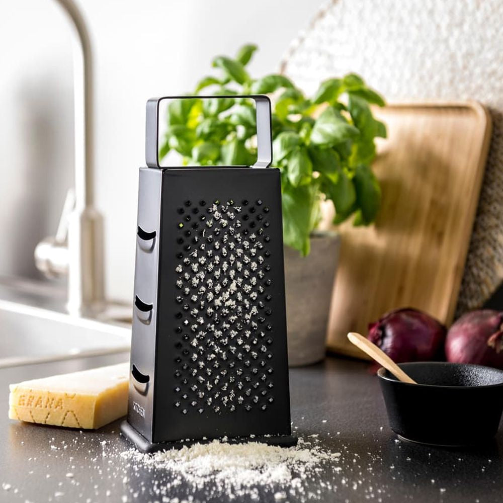 Grate cheese, vegetables, and more with ease using the Kitchen Craft Black Non-Stick 4-Sided Box Grater. Crafted from premium 430 stainless steel with a stylish black finish, this grater combines durability, functionality, and modern design. Its four-sided tower construction provides multiple grating options — fine, coarse, slicing, and zesting — to suit all your cooking needs.